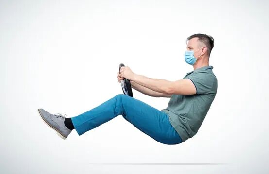 帶口罩的人拿著方向盤駕駛一輛汽車 – 警惕病毒的概念